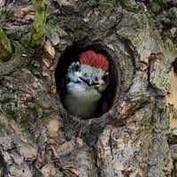 Great Spotted Woodpecker / Buntspecht ( Dendrocopos major ), juvenile, chick, looking out of nest hole, Europe.