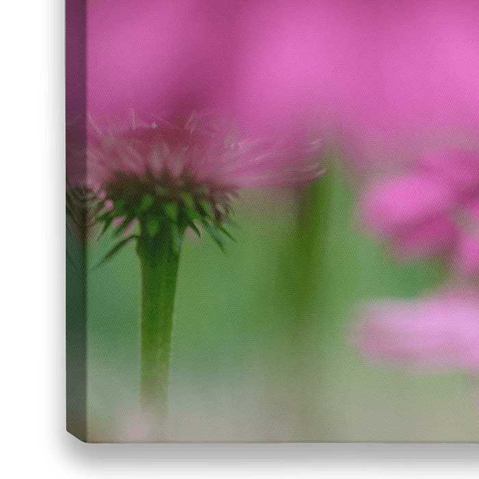 close up van een fuchsia echinecea bloem, met op de voorgrond doffe bloemen en een groene achtergrond