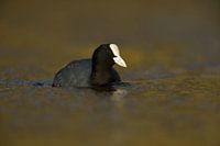 Fulica atra / Black Coot / Blässhuhn / Blässralle swimming on nice coloured water.