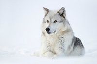 Grijze wolf ( Canis lupus) in de winter, liggend, rustend in de sneeuw, aandachtig kijkend, Yellowstone gebied, Montana, USA.