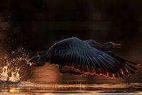 In het eerste licht van de zon vertrekt een grauwe gans van zijn slaapplaats naar de omliggende weiden en velden. Om hoogte te winnen, moet hij "gas geven" en heeft hij een aanloop nodig. Het tegenlicht breekt in de opspattende waterdruppels en zorgt voor een heel bijzondere sfeer in de foto. Een actievolle, heldere foto die…