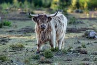 Blonde schotse hooglander koe op de heide. Rode schotse hooglander op de hei. Naast rode en zwarte komen er ook blonde varianten voor. Koeien hebben wijd uitstaande, naar boven gerichte horens, terwijl die van de stieren horizontaal naar voren staan.