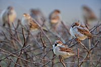 Koop dit vogel kunstwerk in de heg van de buren... Huismussen *Passer domesticus*, mussen van wunderbare Erde op canvas, aluminium dibond, (ingelijste) fotoprint, behang en ArtFrame, op maat geprint in Fine-Art kwaliteit.
