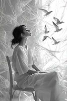 Een schilderij toont een jonge vrouw zittend op een eenvoudige stoel, omringd door zwarte vogels die rondom haar vliegen. Haar zachte, dromerige blik geeft het tafereel een serene sfeer, terwijl de vogels symbool staan voor vrijheid en harmonie. De delicate penseelstreken en zachte tinten brengen een gevoel van vrede en verbondenheid…