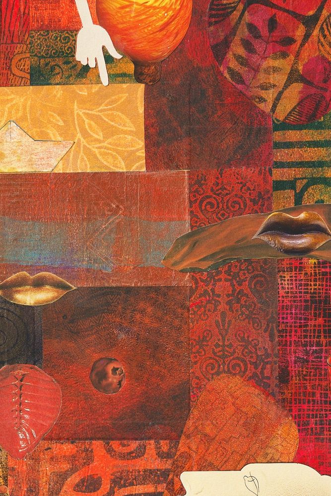collage van afbeeldingen op een achtergrond van diverse rechthoekige image transfer gelliprints in voornamelijk rode en oranje tinten