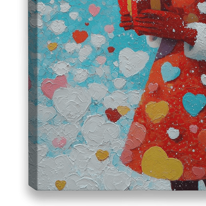 Visueel domineren twee elementen: de figuur zelf — een meisje met een rode muts, rode handschoenen en een warme kraag — en de overvloed aan harten/sneeuw rond haar. Het meisje staat in zijaanzicht, neus licht omhoog, met een zachte, bedachtzame uitdrukking; dat rustige profiel contrasteert met de levendige textuur van de achtergrond. Het kleine cadeau met een gouden strik in haar handen is een miniatuurbrandpunt dat de blik terugtrekt naar de menselijke aanraking in het werk. Deze voorstelling functioneert perfect als kerst schilderij en als winter schilderij; het roept de verwachting van geven, warmte en verrassing op.