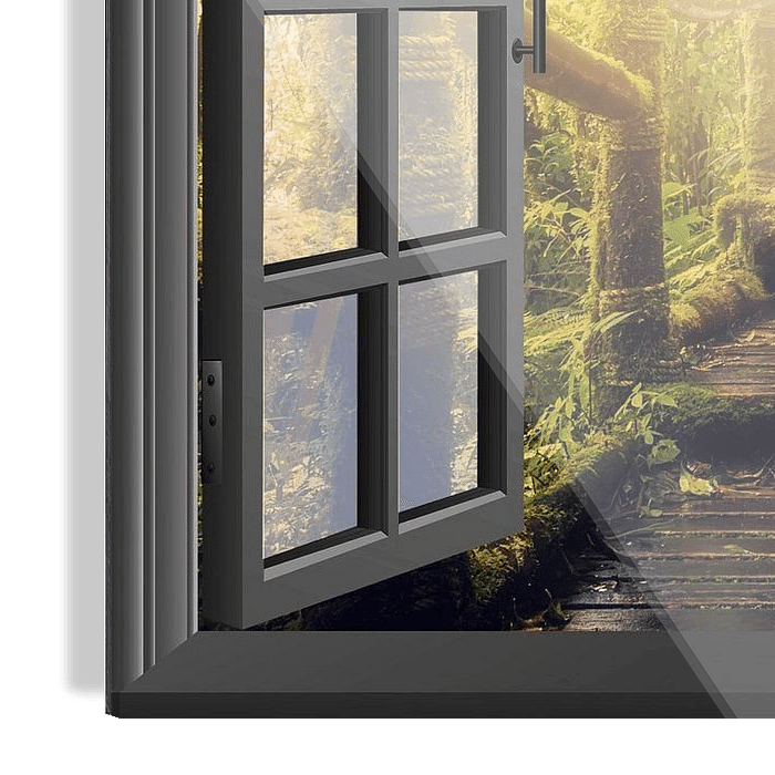 Kijken naar een tijger uit een raam. Dit prachtige werk laat je kijken naar de prachtige kleuren van de natuur waarin een tijger van de trap loopt. vanuit een mooi donkergrijs raam krijg je een mooi effect. Dit werk is van hoge kwaliteit.