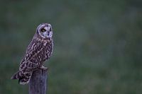 Short-eared Owl / Sumpfohreule ( Asio flammeus ) at dusk in last twilight, perched on a fence pole, hunting, intensive bright eyes.