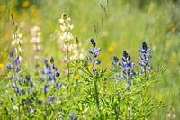 Blauwe en lichtroze lupines geven het gras kleur, de plant hoort bij de vlinderbloemigen. Deze stonden langs de weg in het noorden van Portugal.