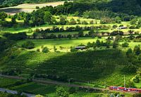 Spoorlijn aan de noordoever van de Duitse rivier de Moezel met een licht en donkerspel van de schaduwen van de wolken