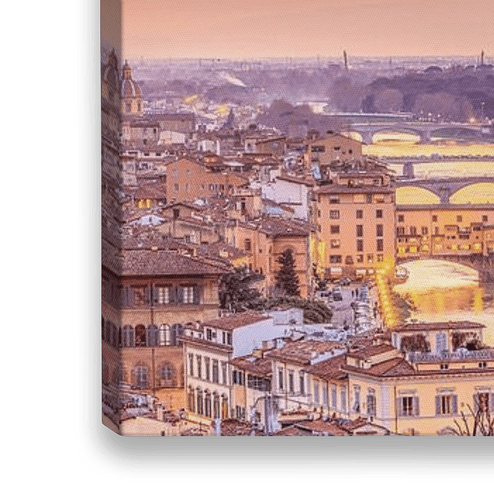 De afbeelding is genomen vanaf Piazzale Michelangelo. Duidelijk herkenbaar zijn de Ponte Vecchio, Palazzo Vecchio en de Basilica di Santa Maria del Fiore