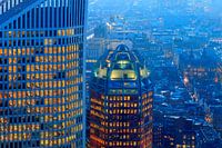skyline van Den Haag bij avond met de moderne ministeries, gezien vanaf New Babylon; Den Haag, Nederland