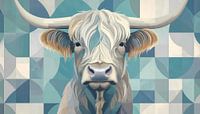 Een koe met hoorns tegen een strak patroon achtergrond met blauw groen tinten