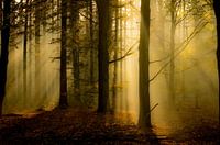 boslandschap met prachtig goudgeel strijklicht zonlicht door de bomen in volle herfst.