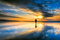 Een strandwandeling in de herfst met zeezicht op het strand tijdens een zonsondergang. Een enkel persoon loopt hier over het Noordzeestrand.