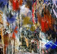 Een kleurrijk mengsel met contrasten van zwart, blauw, rood en wit. Grafiek en schrift vormen een contrast met de structuur.
