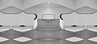 Een fascinerende, bijna surrealistische compositie die wordt gekenmerkt door symmetrie en heldere lijnen. In zwart-wit straalt de foto een minimalistische maar artistieke esthetiek uit. Centraal staat een trap die in het midden van de foto zachtjes naar boven leidt en wordt omlijst door twee identiek gebogen trapleuningen. Deze trap…