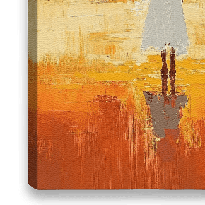 vrouw strand - Dit vrouw schilderij toont een silhouet van een vrouw in een witte jurk met de rug naar ons die naar een felle oranje zonsondergang boven de zee staart, met brede impressionistische penseelstreken en een lange reflectie in het natte zand — vrouw schilderij, schilderij vrouw.
