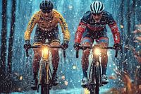 Twee wielrenners razen zij aan zij over een kronkelende weg, omringd door een regen overgoten landschap. Hun kleurrijke shirts contrasteren prachtig met de groene omgeving en lucht. De dynamiek van het schilderij vangt de snelheid en spanning van de race, terwijl de schaduwen op de weg de diepte en realiteit van het moment versterken.