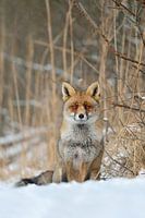 Een vos, of beter gezegd een rode vos, zit op de rand van het riet in de sneeuw. Gespannen afwachtend kijkt hij recht in de camera van de fotograaf. Hij lijkt de situatie niet echt te kunnen inschatten. Is hij misschien in gevaar? De geconcentreerde blik en de opstaande driehoekige oren getuigen van de hoogste spanning... De opname…