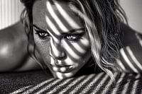 Op de zwart-wit foto staat een elegante vrouw, haar pose straalt sierlijkheid en zelfvertrouwen uit. Gave lichtstrepen vallen subtiel over haar gezicht en lichaam, accentueren haar gelaatstrekken en creëren een spel van schaduwen en highlights. De contrasten tussen licht en donker benadrukken de finesse van haar silhouet, terwijl de…