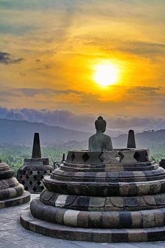 Zonsondergang over Stupa's Borobudur van Eduard Lamping