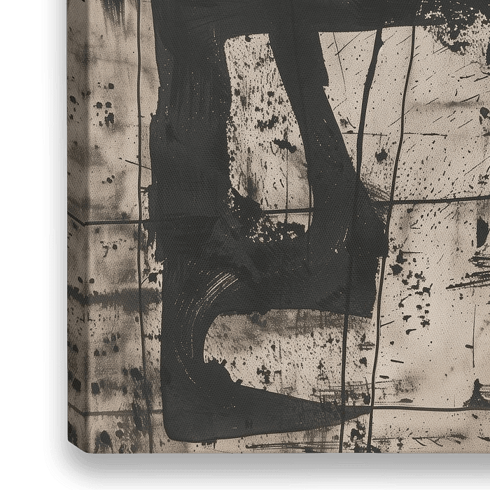 Abstracte zwart-wit compositie met vette, onregelmatige zwarte strepen op een getextureerde achtergrond. Het samenspel van lijnen en vormen creëert een gevoel van diepte en beweging in het werk.