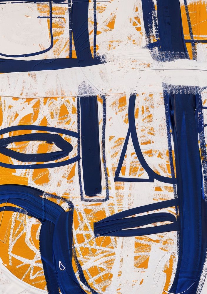 Gedurfde blauwe lijnen en een mix van geometrische vormen creëren een abstracte compositie tegen een oranje achtergrond. Witte en zwarte accenten dragen bij aan de gelaagde en dynamische visuele impact.