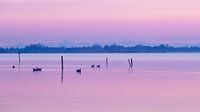 1, 2 en 3 ganzen voor zonsopkomst in het Leekstermeer Drenthe. De lucht kleurde pastel rose en blauw.