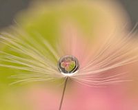 1 paardebloempluisje met daarin 1 kleine waterdruppel waarin de reflectie van een blaadje van een hortensia zichtbaar is in de reflectie. Ik denk dat deze foto ook erg mooi zal zijn op Aluminium!