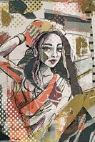 Mixed media kunstwerk met knipsels kranten gecombineerd met acrylverf, aquarel en digitale tekentechnieken. Dit werk is onderdeel van een serie van drie werken in de zelfde kleuren en stijl. Je ziet een dame met oranje lippenstift. Het werk is opgebouwd uit verschillende lagen.