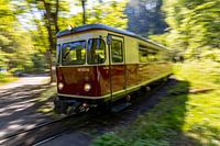 Gezien op een ochtend in mei 2025 bij het station "Steinerne Renne" van de Harz smalspoorlijn (HSB). Een Talbot Aachen treinstel, gebouwd in 1955, op weg naar Wernigerode. Het treinstel raast door de krapste boogstraal van de HSB van slechts 60 meter. De bestemming is het HSB-station in Wernigerode.