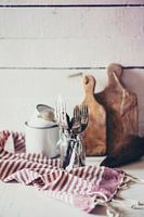 Rustiek serviesgoed, service, vorken, vork, theedoek, snijplank, witte achtergrond, rustiek, bruin, wit, keuken gerei, keuken, gerei, hout, houten muur