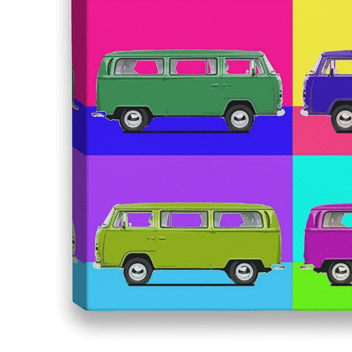 12 x Volkswagen bus in popart-stijl. In felle kleuren. Autokunst
