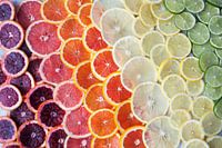 fruit, gezond, kleurrijk, fel, felle kleur, felle kleuren, citrus, citroen, sinaasappel, paars, violet, grapefruit, rose, roze, oranje, geel, wit, geel, limoen, groen, schijfjes, patroon, fruitig, zomer, zomers, sap, sappig, regenboog, kleurverloop
