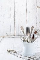 rustiek, vintage, retro, authentiek, wit, hout, houten, koken, keuken, lekker eten, bestek, vork, lepel, vorken, lepels, witte achtergrond, witte verf, linnen doek, keukengerei