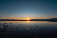 Deze foto maakte ik tijdens zonsondergang, op een wintermiddag om 16:37 uur. Het moment waarop het licht nog net aanwezig is, maar al duidelijk aan het verdwijnen. Ik heb gekozen voor een centrale compositie waarin de zon, de horizon en de reflectie samenkomen in één rustige lijn.