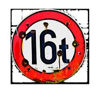 Roestige kogelgaten op een verkeersbord met gewichtslimiet van 16 ton