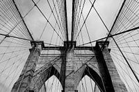 De stalen kabels die vanaf de boogpoorten naar het wegdek lopen van de Brooklyn Bridge in New York.