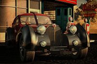 De 1938 Bugatti Atlantic S87 SC is een uitzonderlijke race auto die vele races won in de jaren 1940. De Bugatti Atlantic heeft veel bijgedragen aan Bugatti's roem . Hier heb ik deze... afgebeeld bij een oud benzinestation.