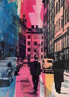Een poster van een smalle straat ergens in Europa in de jaren 1950 met geparkeerde auto's en twee mannen die lopen.