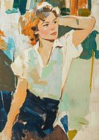 Een olieverfschilderij van een aantrekkelijke vrouw. Het schilderij wordt gekenmerkt door losse penseelstreken, de geportretteerde draagt een wit overhemd en blauwe rok en speelt zich af in de jaren 1950. Het schilderij is in kleur, met heldere kleuren en zichtbare penseelstreken, en een groene muur op de achtergrond.