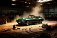 De Jaguar Type E Racing uit 1960 is een meesterwerk van design en techniek en dit schilderij legt de essentie ervan vast door de ogen van een kunstenaar. De auto, gehuld in een diep Brits racegroen, vormt het middelpunt van de compositie en straalt zowel elegantie als rauwe kracht uit. Zijn slanke rondingen en chromen accenten glanzen…