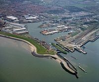 1986: Historische luchtfoto van de haven van de stad Vlissingen in de provincie Zeeland, Nederland.