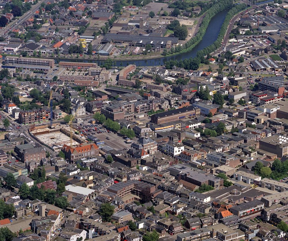 1990: Historische luchtfoto van de stad Apeldoorn op de Veluwe in de provincie Gelderland in Holland