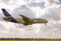 Aankomst van de eerste Airbus A380 op Schiphol Airport op 15 juli 2010, voor het testen van de technische afhandeling op Schiphol.