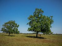 op dit langschap zijn 2 bomen te zien met een Damhert onder 1 van de bomen. Hij zit daar van de bladeren te snoepen.