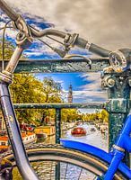 Doorkijkje door fietsen op de brug bij de Prinsengracht, Amsterdam. Woonboten, rode rondvaartboot en de Westertoren in de verte. Kleuren rood, geel en blauw. Variatie op een bekend Nederlands thema.