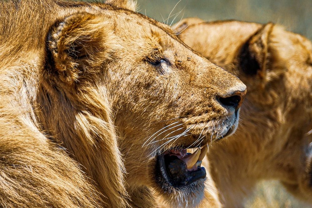 Leeuw en leeuwin liggen lui naast elkaar te gapen in de namiddag zon. Waarschijnlijk hebben ze net hun prooi opgegeten. Foto genomen op de groene gele steppe van Tanzania. Bokeh, portret, close-up, reis fotografie.