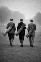 Drie figuren bewegen zich weg van de plek waar zojuist alle aandacht samenkwam. Hun tempo is rustig, hun houding ontspannen. De golftassen hangen los over de schouder; er is geen nadruk meer op doel of prestatie. Wat rest is beweging door ruimte.